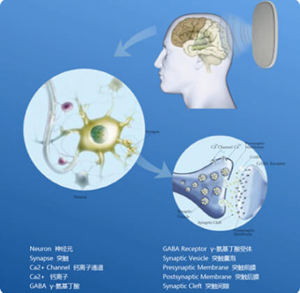 在大脑内部产生感应电流,深入人体,增加脑内γ - 氨基丁酸以及睡眠相关物质的释放,从而有稳定情绪、镇静等作用,减弱大脑皮层的兴奋程度,进而促进睡眠启动。